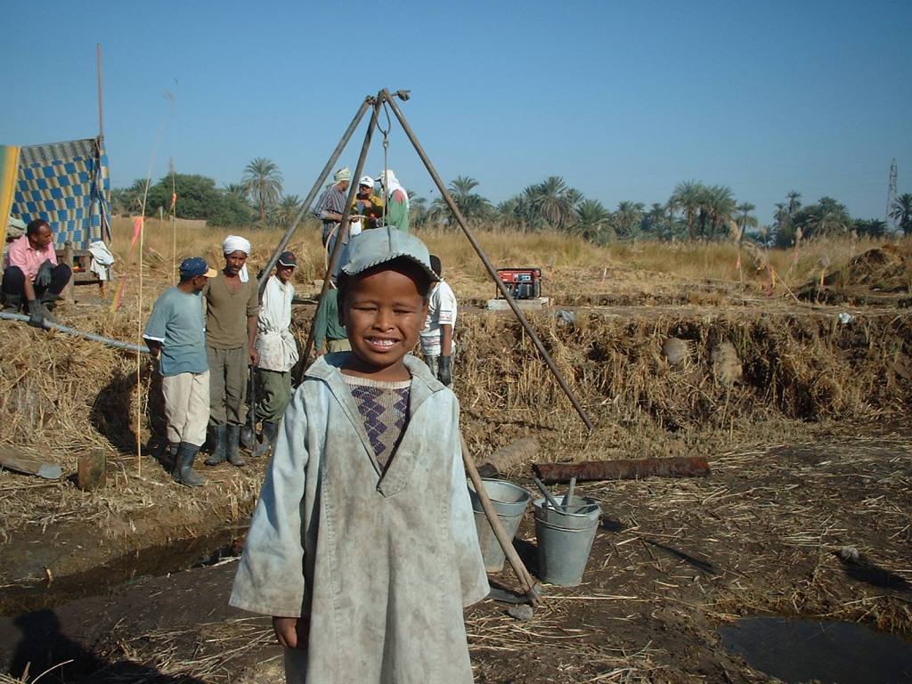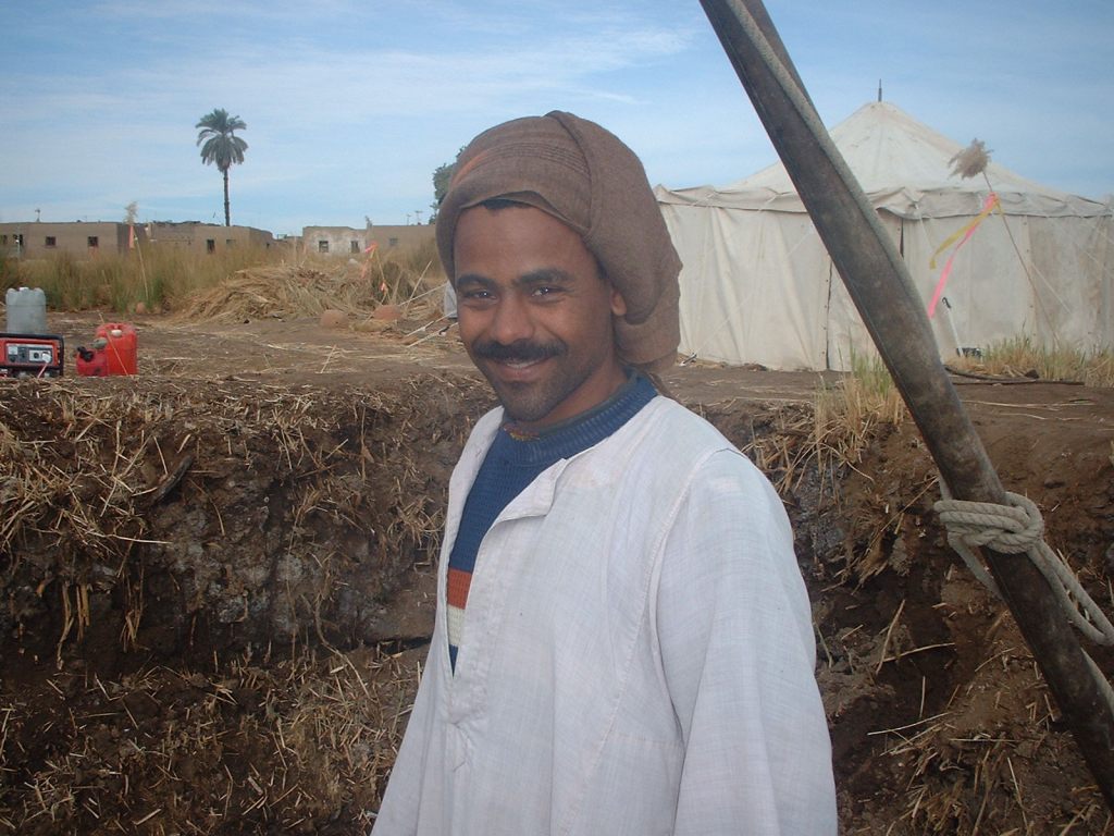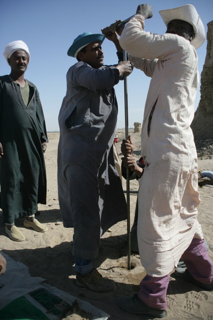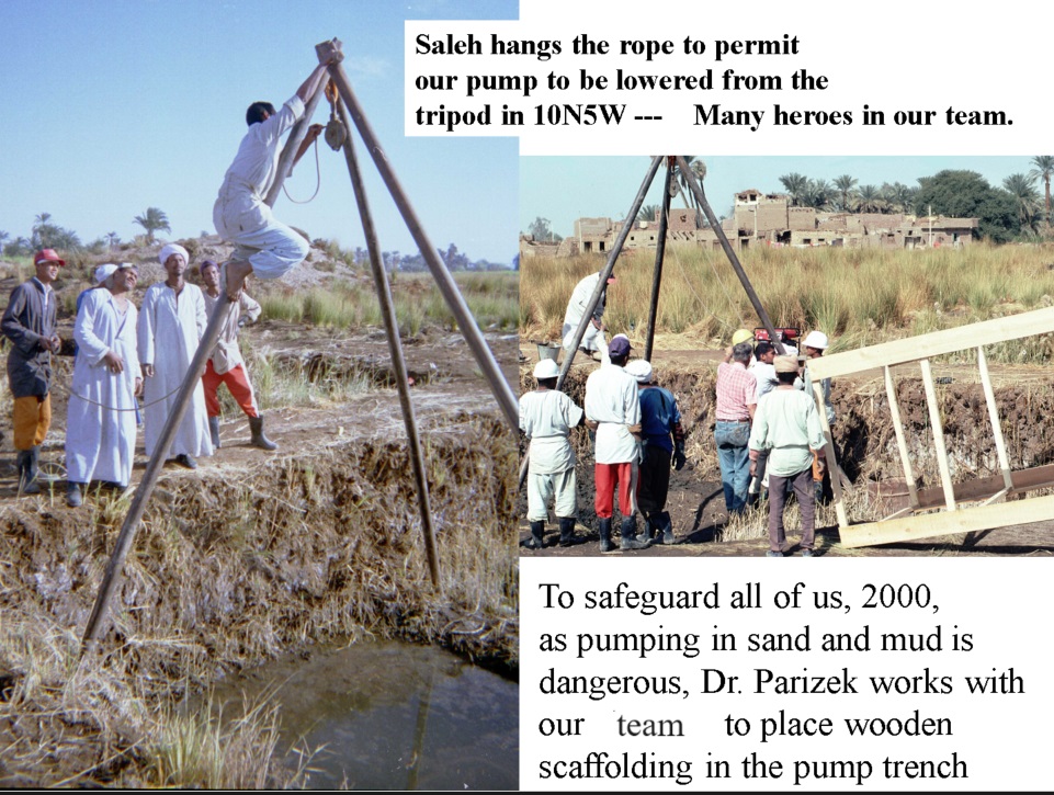 Many ways the site demands care and teamwork. The reeds in 2001 enjoy the rising groundwater in wet areas at Temple-Town Hierakonpolis until 2006 when the salt was too much and the plants became yellow and were dead. Osama the tall with Hafas cut the reeds to permit pump tests, 2001.