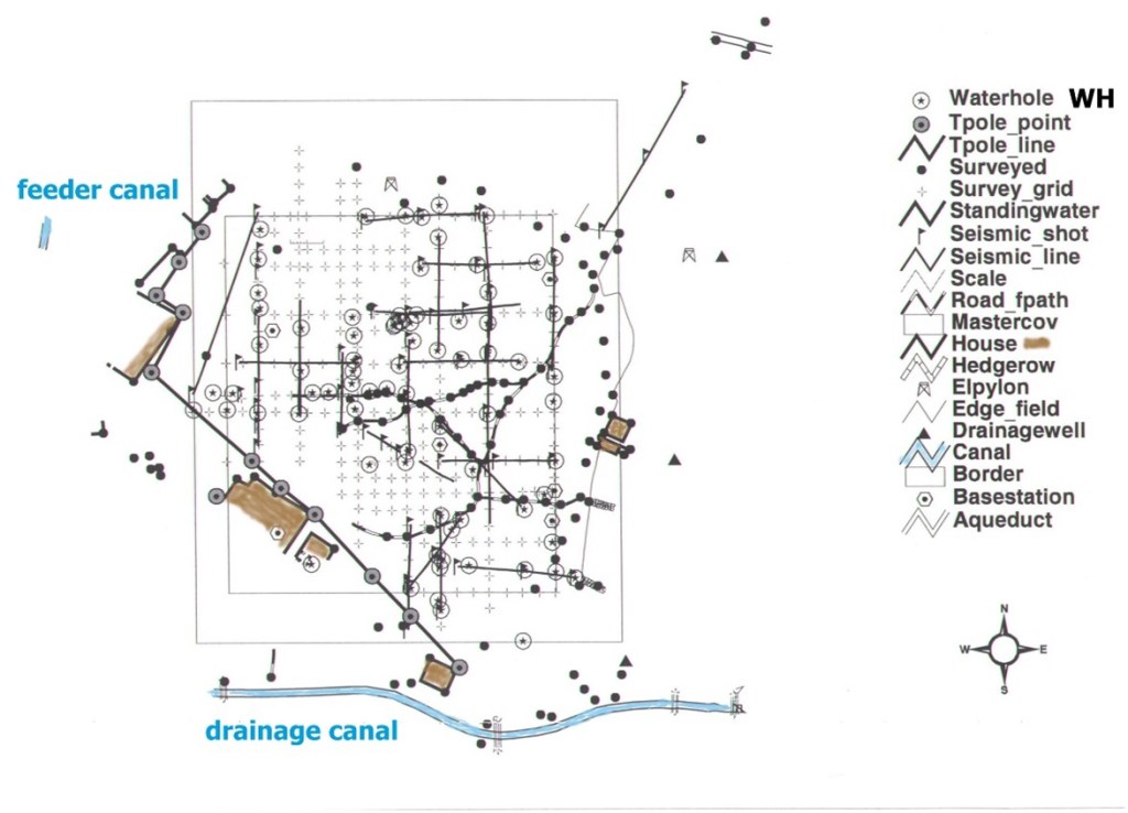 GIS generated map with locations of 1999 seismic surveys and monitoring wells WH at the Temple-Town Hierakonpolis main site, framed by houses on west and a few on the south (Cakir, 2001).