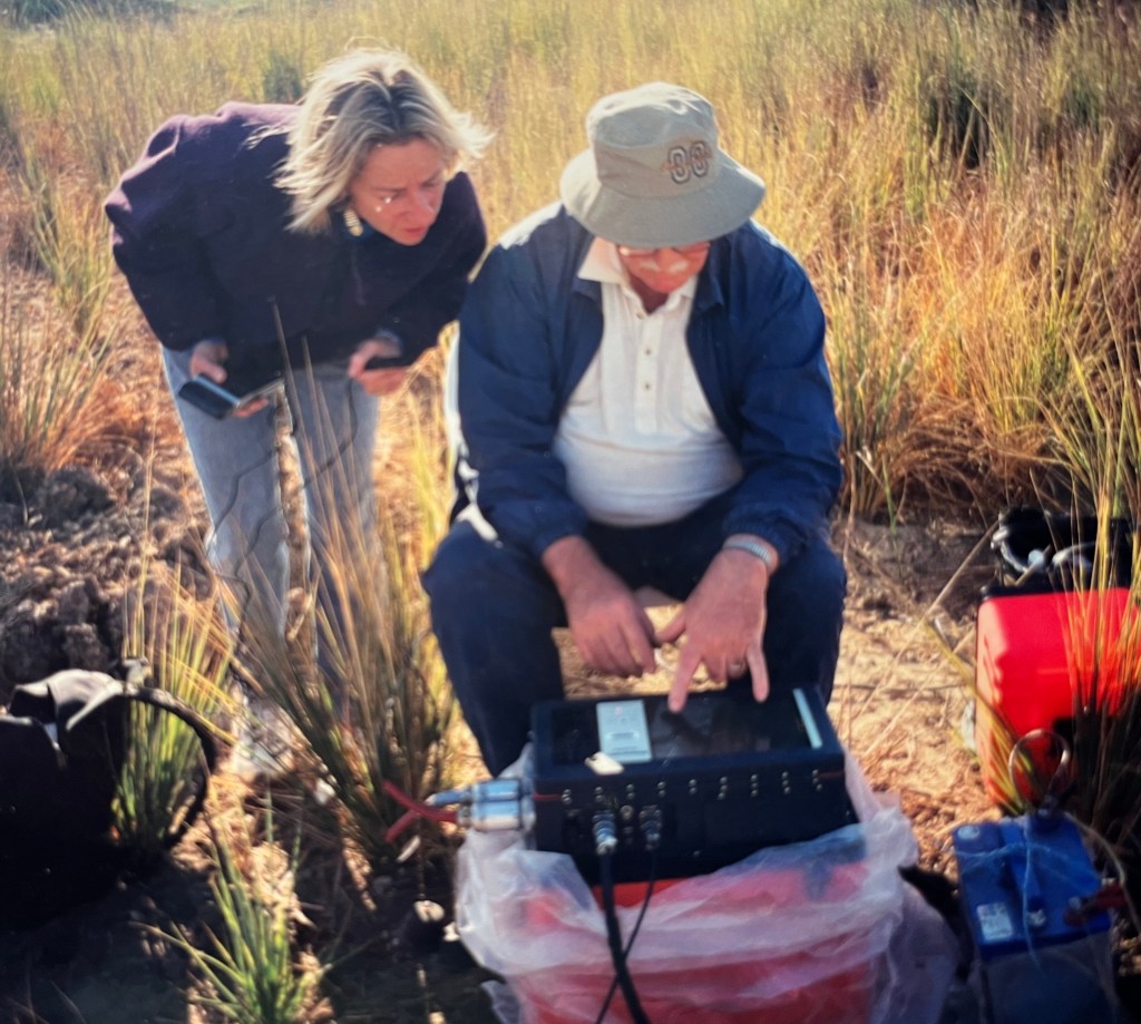 Happy to share and to teach, Shelton points out the on site data and refraction from sound waves in the seismograph to guest Merlinda Arnold, 2000.