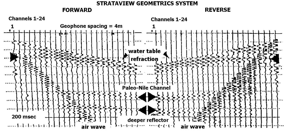 1997 Seismic data (upper example) from Dr. Alexander’s surveys provide new information: ground water, less than 2 m in depth and recurrent prominent reflectors, deep strata, 30 and 100 m which underlie the site and are shallow below the Wadi Abu Sufian ( lower illustration – Dr. Walters 1999 and employed by Dr. Alexander)