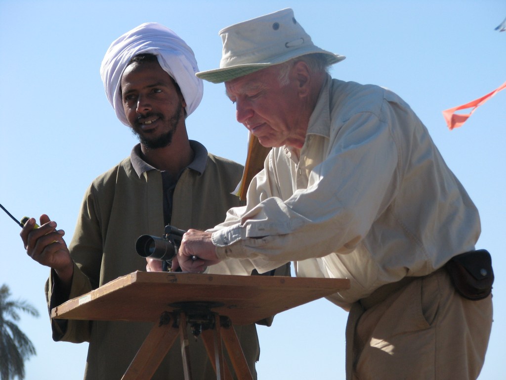 Actually a foursome (rod man not in view) seen by Mohamed Ibrahim and Mohamed Saad 2000 while Kamal Sidein offers his orange cap to shade the lens of the alidade (Felicia’s photo)