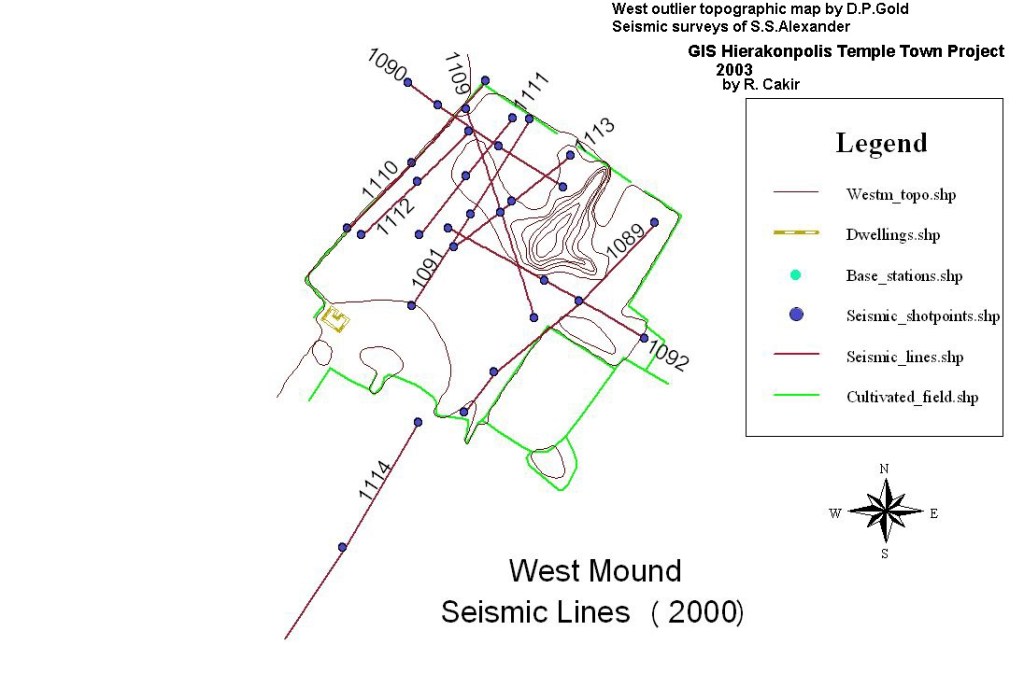 West outlier is the grass small mound in the foreground and has 30 m partly cut by bulldozer for farming in 2000. Seismic surveys are also shown on the map (below) of this mound. The contours from Gold’s on site surveys and numbered lines are seismic surveys – digitized by Dr. Recep Cakir who made this GIS map of the west outlier.
