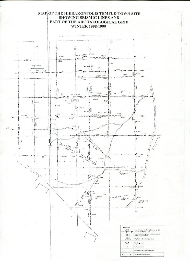 The large maps for Temple-Town Hierakonpolis has two outlier mounds, west one surveyed in 2000 and connect to the desert, the local and regional context. Gold’s archaeological 10-meter quadrants span all and continue the archaeological grid of Fairservis, Hierakonpolis Project 1967-94.
