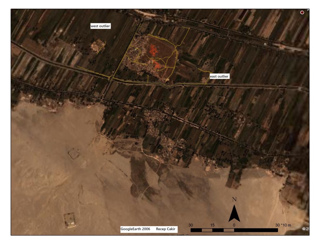 The Main site Temple-Town Hierakonpolis on Googleearth 2007 has the archaeological grid from Fairservis excavations (marked red by Recep Cakir, GIS). Duff’s measurements extend beyond housing and into farmland because the Temple-Town Hierakonpolis occupies a large main area >3600 m. Into the fields are two outlying sites marked on the image above. Below this west grassy area is part of the small west outlier.